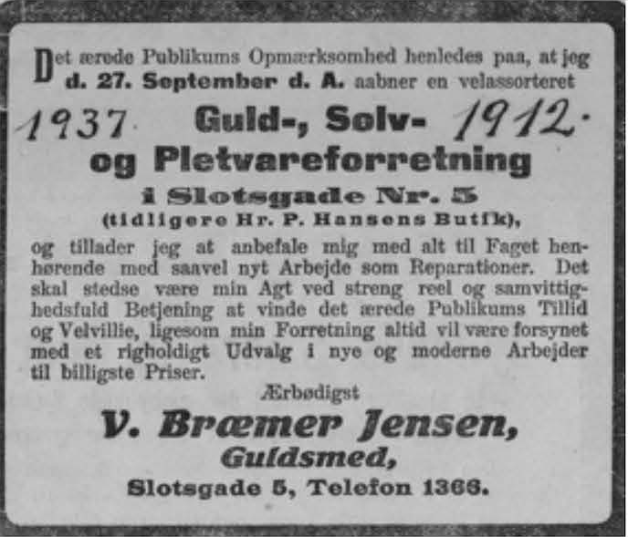 1912: Guldsmed Bræmer-Jensen annoncerer åbningen af butikken